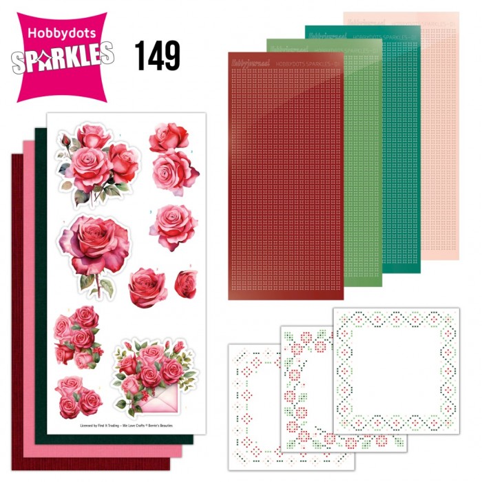 Deze set met Hobbydots-Sparkles bevat alle materialen voor 3 vierkante kaarten. De inhoud bestaat uit vier Sparkles stickervellen, drie 3D-afbeeldingen, drie witte oplegkaarten met bijpassende patronen en drie vellen kaartkarton. Het patroon is in kleur voorgedrukt op de oplegkaarten, waardoor je de stickers, zonder een Led Board te gebruiken, direct hierop kunt plakken. -