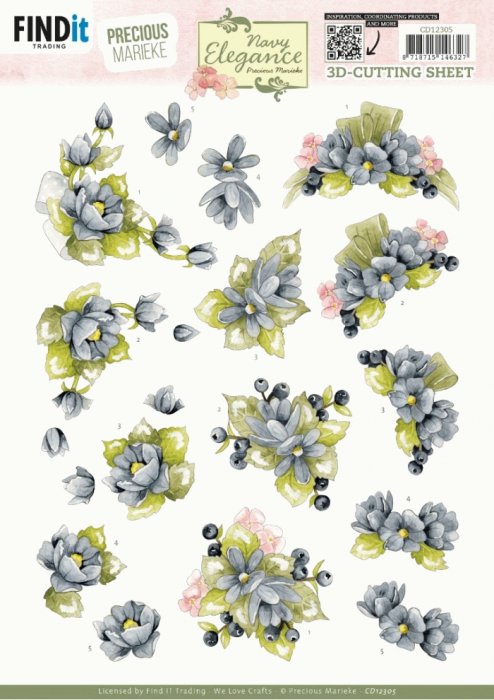 3D Cutting Sheet - Precious Marieke- Navy Elegance - Blue Flowers